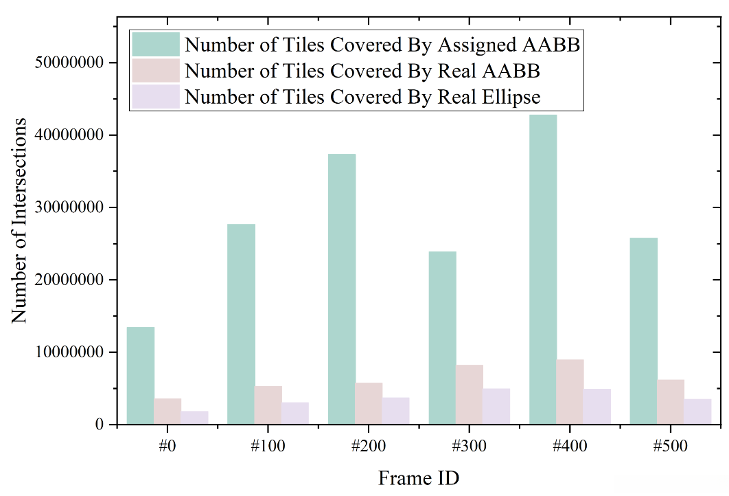 We evaluate the key-value pairs binning process from the rendering process of 6 frames in the scene trained from MatrixCity[16] dataset. The number of assigned k-v pairs is much more than the number of tiles really covered by the AABB or the projected ellipse.
