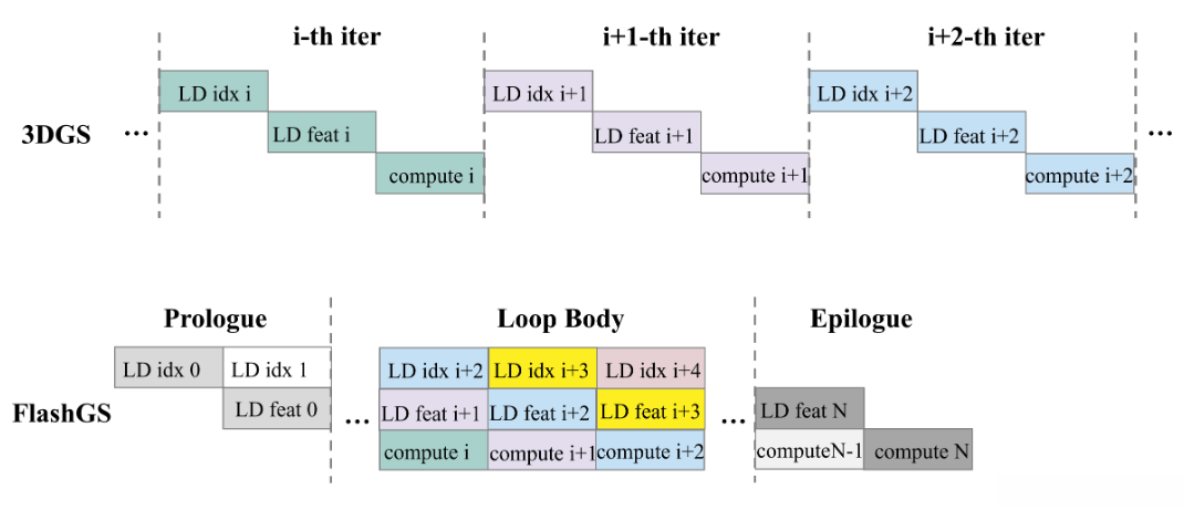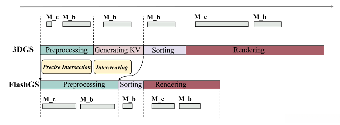 Schematic for the workflow of original 3DGS and the improved FlashGS. We balance the computation and memory access across various stages and reduce redundant operations (M_c andM_b are indicative of the amount of computation and memory access , respectively).