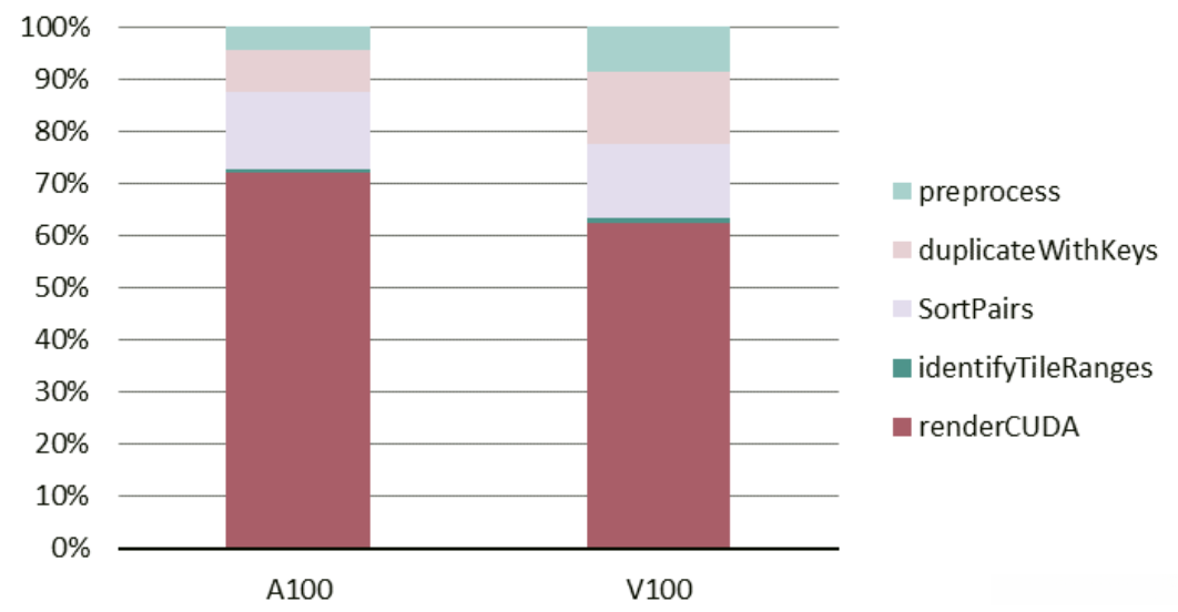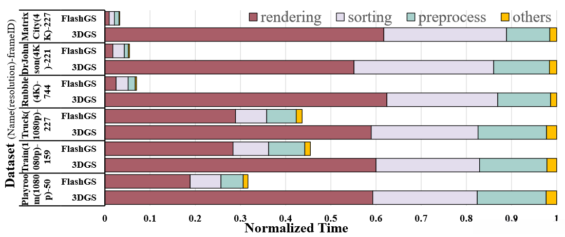 Rasterization runtime breakdown on 6 representative frames from different datasets, normalized to 3DGS.