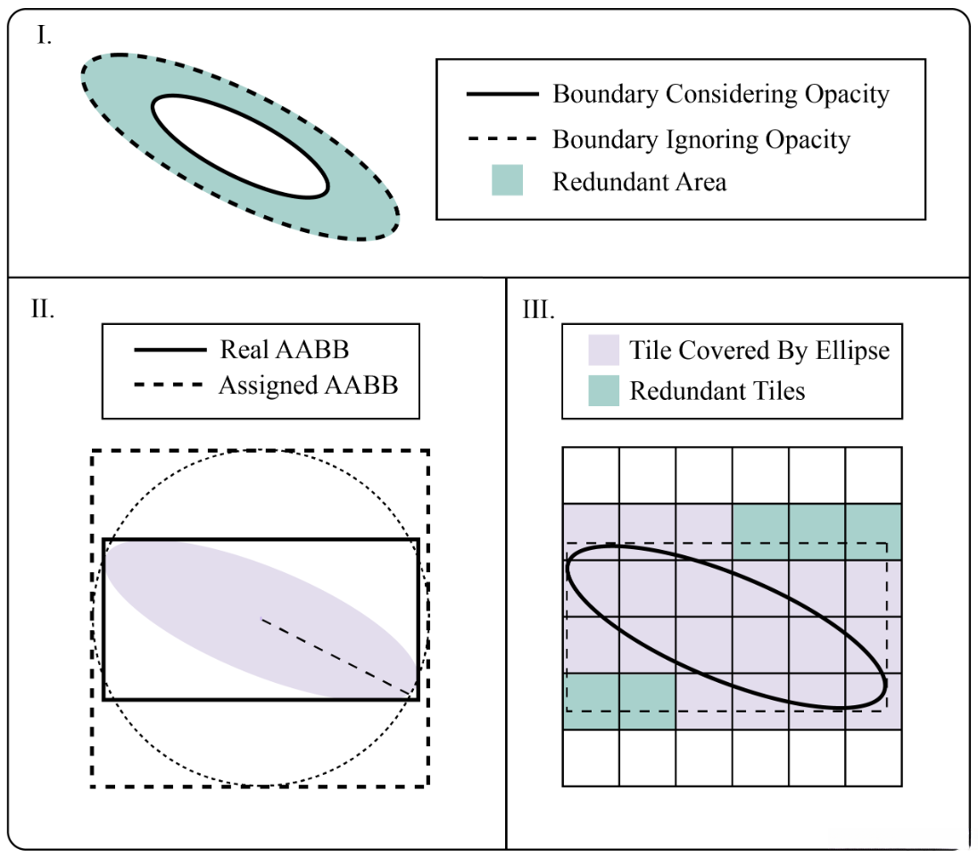 Geometry Redundancies. There are 3 kinds of redundancies in original 3DGS intersection algorithm: I. The definition of ellipse ignores the opacity. II. The AABB is overestimated. III. The tiles out of the ellipse are binned with the Gaussian.