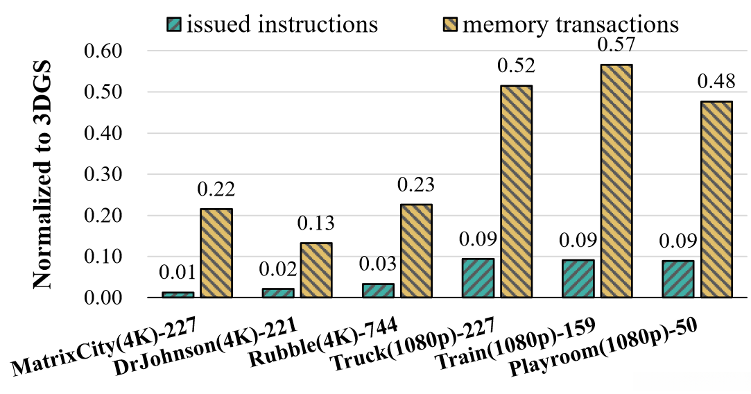 Profiling results of FlashGS: The number of instructions issued in rendering and the memory transactions in preprocessing. All results are normalized to 3DGS.