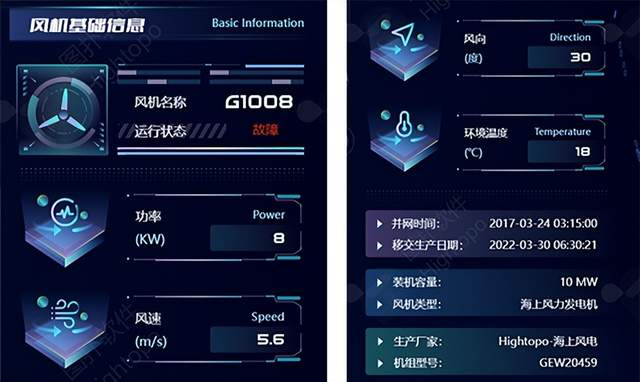 图扑公司推出了基于HTML5和WebGL技术开发的一款创新性3D科幻风力发电机。这款设备通过高科技手段让各款风力发电机的功能特性一目了然地呈现在观众面前。在这一场景呈现中,则采用科技线框风格来展现机舱内部构造。相较于大多数实景搭建方案,在视觉效果上则更具震撼力与观赏性。特别值得一提的是,在展示风机内部结构的同时,在机舱两侧还设置了该机型周边环境参数、海上气象数据、设备运行参数等内容。