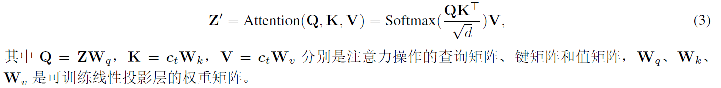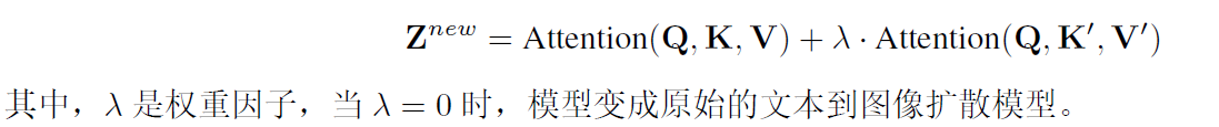 该图像特征借助具有解耦特性的改进型cross-attention模块与预训练UNet架构实现了融合,在SD框架下,通过将clip生成的文本编码器输出作为UNet输入,并在交叉注意力机制中进行处理。其中给定query特征z和textual feature ct时,交叉注意力机制处理后的结果即为z: