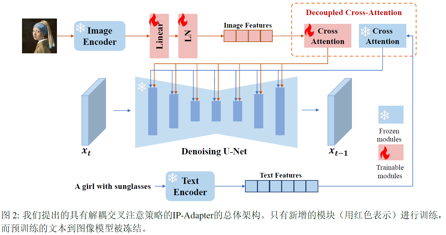 现有adapter难以实现对精调图像提示或从零训练模型的有效支持。其根本原因在于图像特征embedding在预训练模型中的嵌入效果存在明显局限。具体而言,现有方法通常仅将拼接后的特征输入至固定不变的cross-attention模块中,并未充分考虑细粒度信息的需求。为此,我们提出了一种创新架构——IP-adapter,在其设计过程中做了如下安排:1.基于此,首先通过独立于文本信息的图像编码器提取高质量视觉表征;2.随后,在解耦设计的基础上构建了具有独特注意力机制的适配模块。该模块旨在将视觉编码与文本表示进行高效融合,在保持二者独立性的同时实现相互促进关系。最终目标是使扩散模型能够更精确地捕捉和表达用户提供的视觉提示信息。