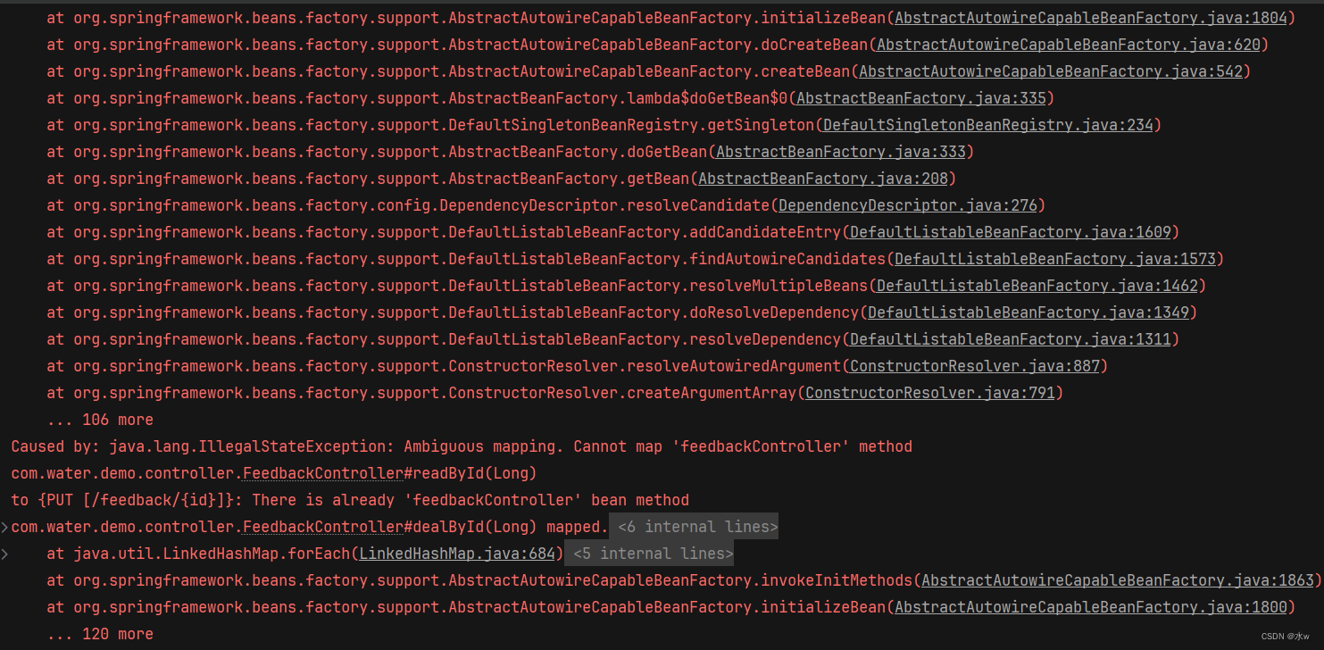 二、报错Error creating bean with name 'requestMappingHandlerMapping' defined in class path resource [org/springframework/boot/autoconfigure/web/servlet/WebMvcAutoConfiguration$EnableWebMvcConfiguration.class]: Invocation of init method failed; nested exception is java.lang.IllegalStateException: Ambiguous mapping. Cannot map 'feedbackController' method