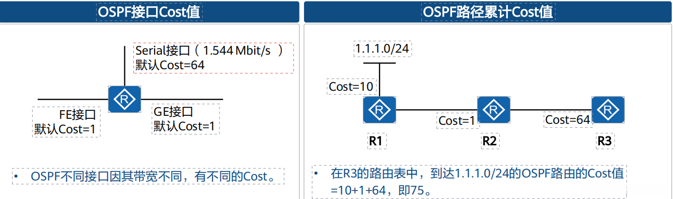OSPF使用Cost(开销)作为路由的度量值。每一个激活了OSPF的接口都会维护一个接口Cost值。