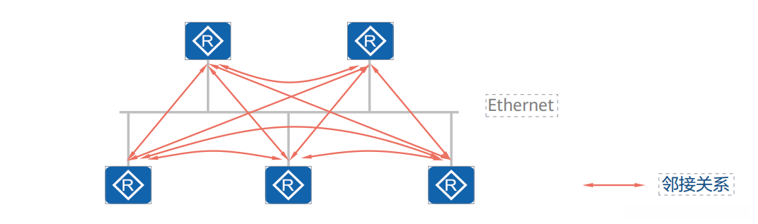 在MA网络中,如果每台OSPF路由器都与其他的所有路由器建立OSPF邻接关系,便会导致网络中存在过多的OSPF邻接关系,增加设备负担,也增加了网络中泛洪的OSPF报文数量。
