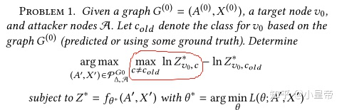 我们的目标是确定一个图,该图在target node上的最大分类概率与原图的分类概率之间的差值最大化,其中所有候选图都必须满足扰动限制的约束条件。