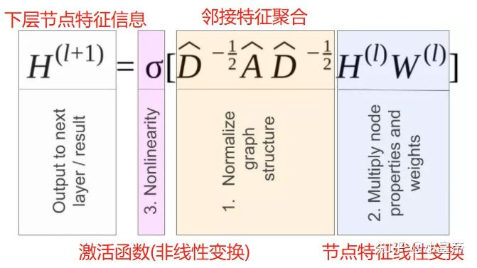 图神经网络各层间的传递函数的一般型式下图片描述的很清楚了: