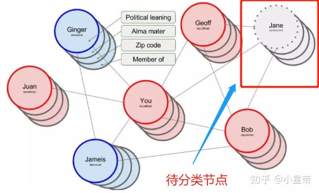 每个节点(个人)都具有若干属性,例如,在分析政治立场的案例中,每个人的一些因素会影响其政治立场,包括政治学习、母校、邮政编码以及家庭成员等。实际上,到此为止,每个人的一些信息可能已经足以对所属类别进行大致判断,但通过图的结构,预测的准确性和力度将得到显著提升。