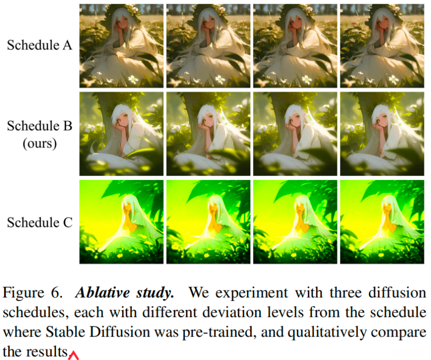 为了验证我们在训练过程中所选择的扩散过程中的噪声计划,我们进行了消融研究。在前面部分,我们讨论了采用略有调整的扩散计划以改善视觉质量。在此,我们尝试了三种先前研究中采用的具有代表性的扩散计划(见表2),并在图6中展示了相应结果的视觉比较。在我们的实验中,采用了三种扩散计划:计划A基于预训练Stable Diffusion;计划B是我们采用的方案,与SD的计划在beta序列计算方式上存在差异;计划C则用于DDPM [5] 和 DiT [18],与SD的预训练计划差异较大。