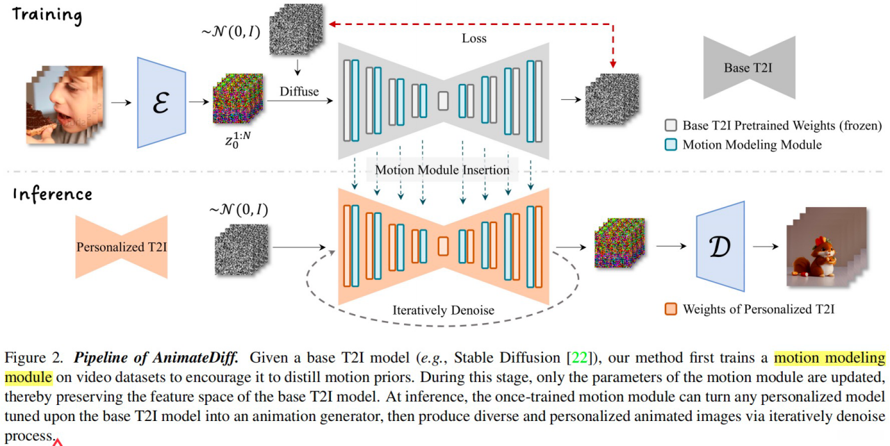 尽管通过其卓越的视觉质量,使用 DreamBooth 或 LoRA 训练的个性化文本到图像模型已经引起了广泛关注,但它们的输出为静态图像,缺乏时间自由度。换句话说,缺乏时间自由度。鉴于动画在现代应用中的广泛存在,我们希望将大多数现有的个性化 T2I 模型转变为生成动画图像的模型,同时保持原始的视觉质量。最近的研究 [7, 12, 33] 提出了将时间建模融入原始 T2I 模型,并在视频数据集上进行优化,以生成动态图像。然而,针对个性化的 T2I 模型,这一过程面临挑战,因为用户需要承担敏感的超参数调整、个性化视频收集以及大量的计算资源。