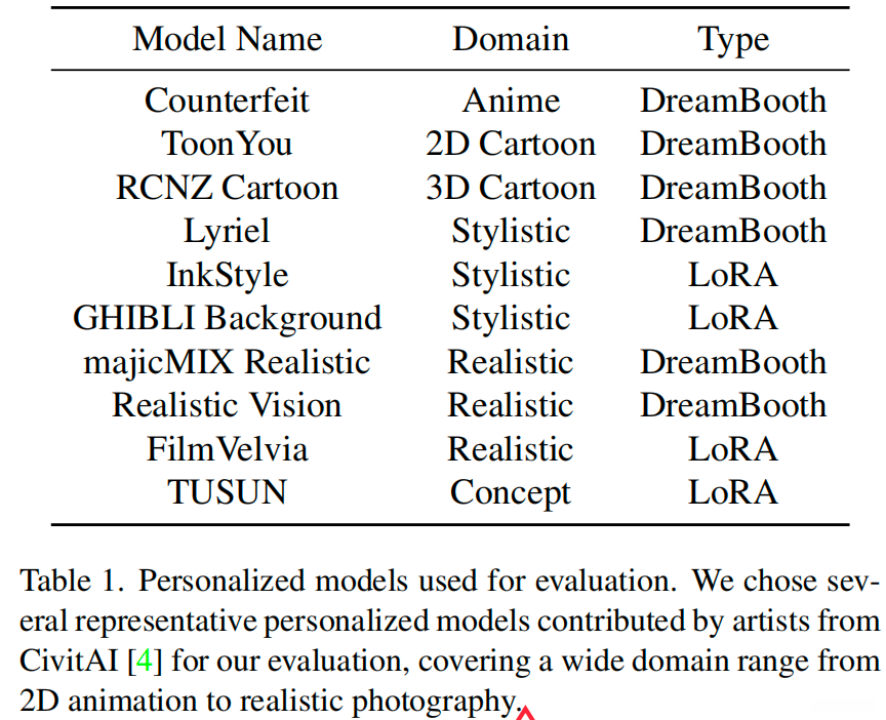 在研究界中有很多不同的个性化方法,但我们的研究集中于基于调整的模型,如 DreamBooth [24] 和 LoRA [13],因为它们保留了基础模型的特征空间。