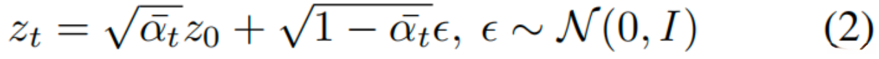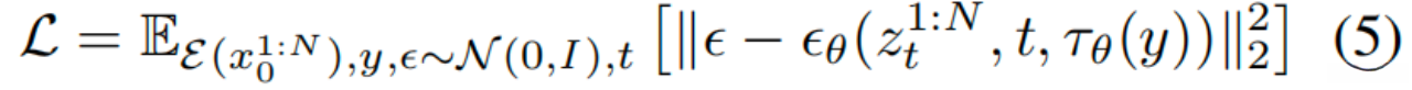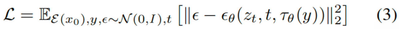 其中,\bar{\alpha}_t = \prod_{i=1}^{t} \alpha_t;同时,\alpha_t = 1 - \beta_t。基于DDPM [5]所提出的训练目标,Stable Diffusion可以表达为: