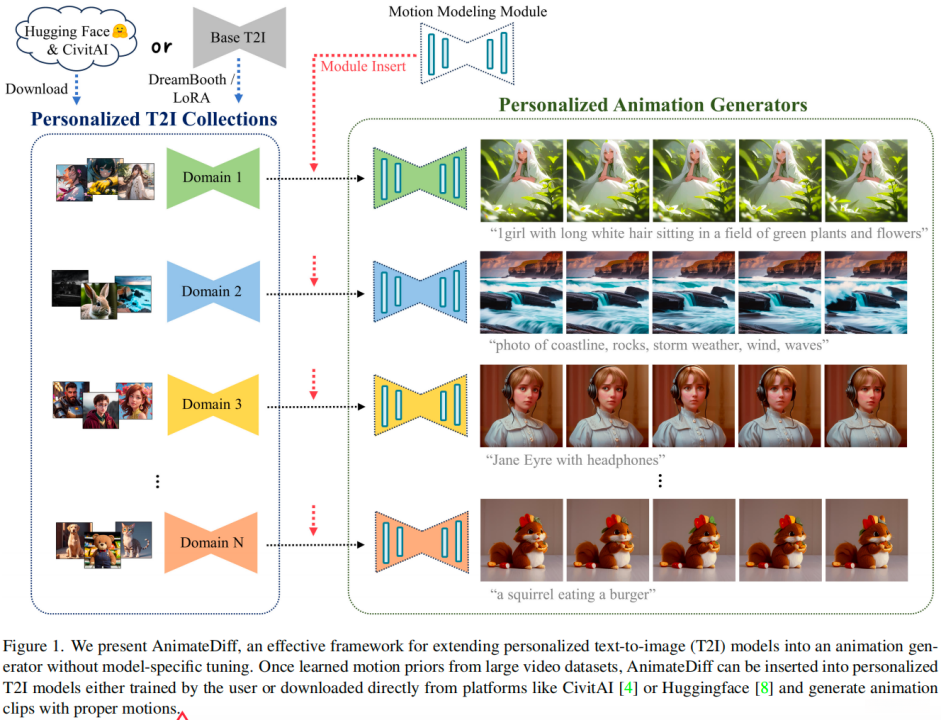 基于文本到图像模型(如 Stable Diffusion [22])及其个性化技术(如 DreamBooth [24] 和 LoRA [13])的进展,每个人都可以以较低的成本将想象力转化为高质量的图像作品。对图像动画技术的需求显著提升,以进一步实现静态图像与动态运动的结合。在本报告中,我们提出了一种通用框架,能够轻松地将现有个性化文本到图像模型升级为支持动画功能的版本,无需针对特定模型进行调整。该框架的核心在于将一个新初始化的运动建模模块整合到冻结的文本到图像模型中,并对收集的视频剪辑数据集进行训练,以提取合理的运动先验知识。训练完成后,只需将该运动建模模块注入到目标模型中,即可实现所有基于相同基础 T2I 的个性化版本自然具备动画功能。我们在动漫图片和现实照片等多领域代表性模型上进行了评估,结果表明,我们的框架帮助模型生成流畅且多样化的动画片段,同时保持了输出的领域特性和多样性。代码和预训练权重将在我们的项目页面上公开提供。