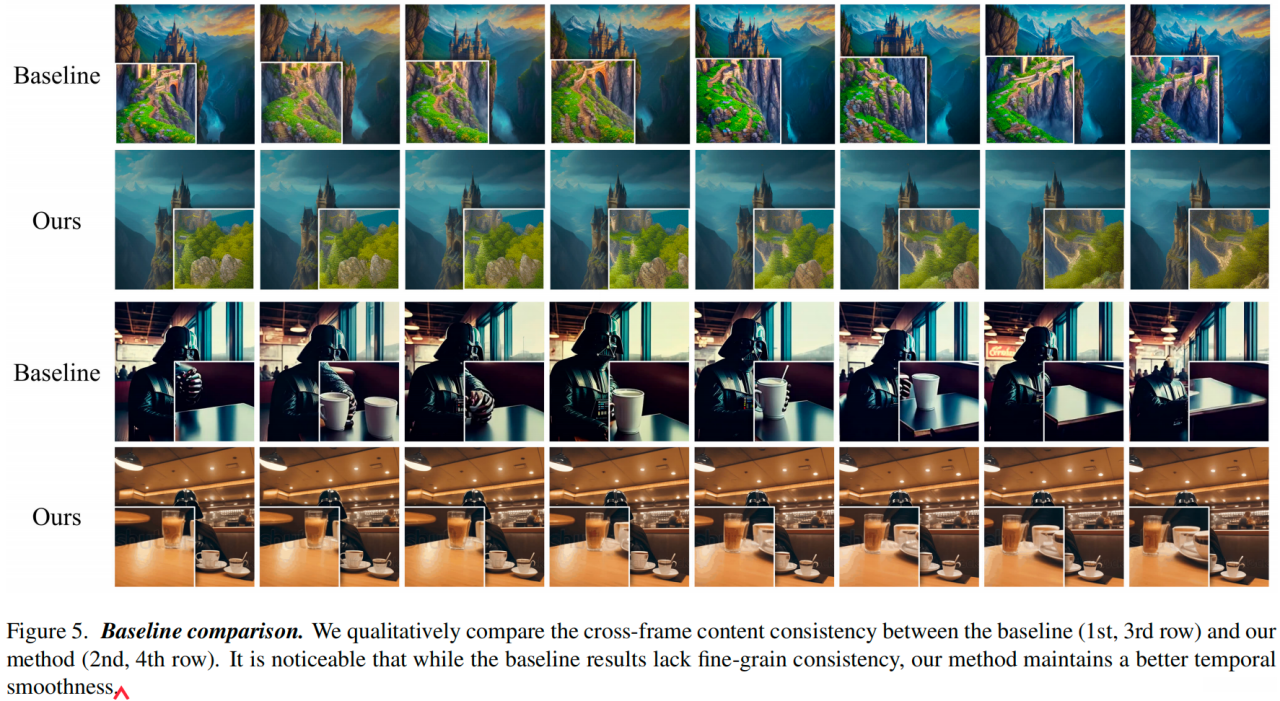 在相同的个性化模型和提示设置下,我们从跨帧细节一致性角度对基线方法与我们的方法进行了对比分析。通过裁剪并放大显示相同区域,我们展示了各帧细节对比结果,如图5所示。