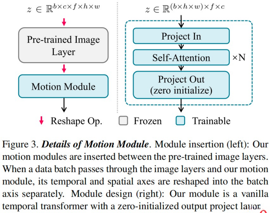 网络膨胀。受限于原始的SD模型仅能处理批处理的图像数据,网络规模的扩展成为必要,以便与我们的运动建模模块实现兼容。该模块以批次 × 通道 × 帧数 × 高度 × 宽度的形式接收5D视频张量作为输入。为了解决这一问题,我们参考了Video Diffusion Model [12]的架构设计。具体实施上,我们将原始图像模型中的每个2D卷积层和注意力机制转换为仅在空间维度上呈现伪三维结构。这一过程通过将帧维度重塑为批次维度,并确保网络能够独立处理每一帧来实现。与现有方法不同,我们在此基础上新增的运动模块采用跨帧操作策略,旨在提升动画片段中的运动平滑性和内容一致性。具体细节请参见图3。