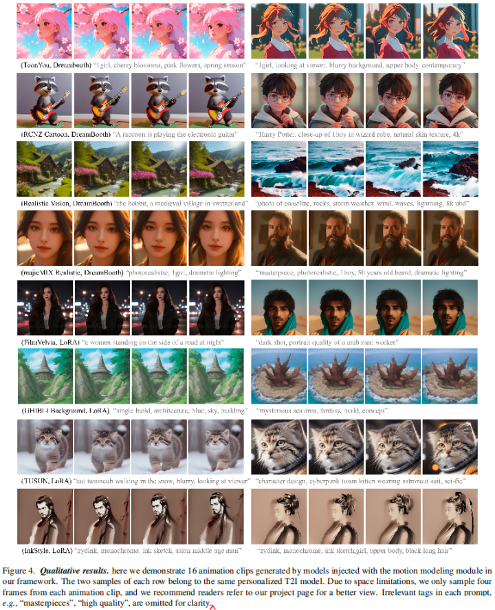 在图4中,我们展示了不同模型的几个定性结果。由于篇幅限制,我们仅呈现了每个动画片段的前四帧。我们强烈推荐读者访问我们的主页以获取更丰富的视觉效果。图中显示,我们成功地将个性化的T2I模型应用于多个领域,包括高度风格化的动漫(图4顶部行)和逼真的照片(图4底部行),同时保持了它们的专业知识。基于视频数据集学习的运动先验,运动建模模块能够理解文本提示,并对每个像素赋予适当的运动,例如,图4中第三行展示的海浪运动和第七行展示的Pallas猫腿部运动。我们还发现,模型能够有效地区分画面中的主体与前景和背景,从而营造出生动且逼真的视觉效果。例如,在图4第一动画中,角色与背景中的花朵按不同速度分离并呈现出不同的模糊效果。