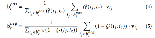 where b 𝑝𝑜𝑠 𝑡 and b 𝑛𝑒𝑔 𝑡 represent the positive and negative sub-basket representations of 𝑡-th basket respectively, and v𝑖𝑗 is the learnable embedding representation for item 𝑖𝑗 . Afterwards, it becomes straightforward to model the sequential interactions for two sub-basket sequences B 𝑝𝑜𝑠 𝑖𝑐 and B 𝑛𝑒𝑔 𝑖𝑐 respectively。