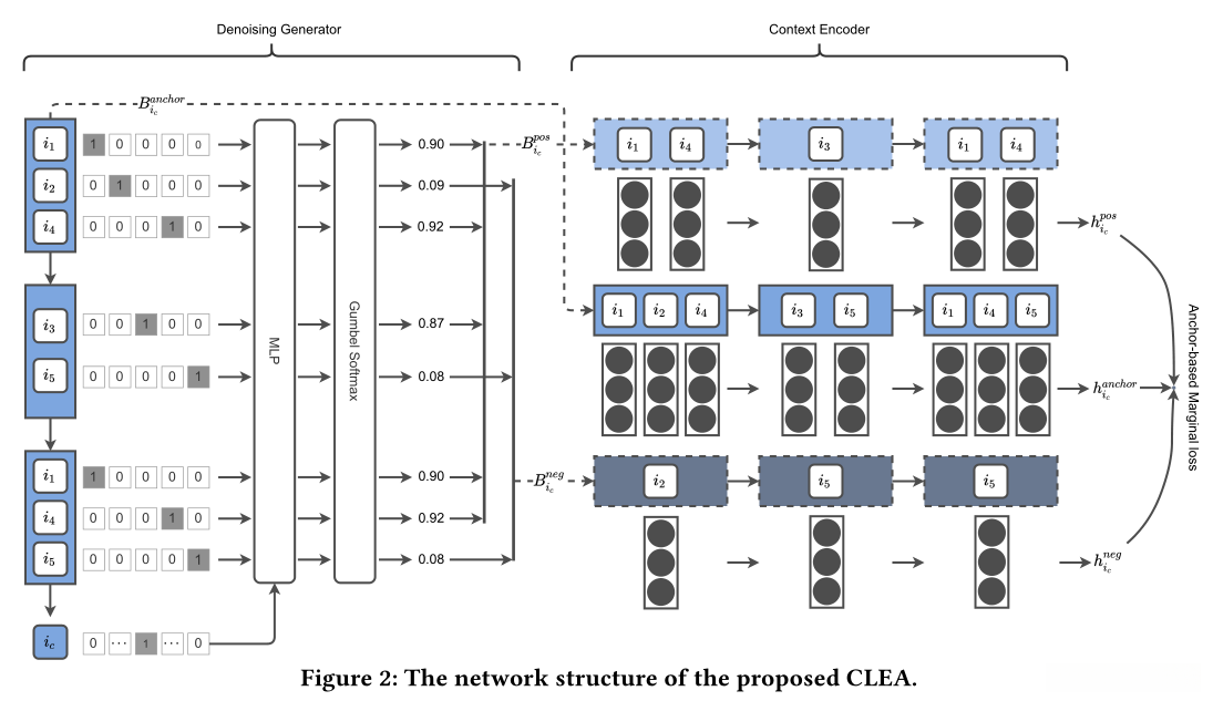 为此,在本文中,我们提出了一个对比学习模型(名为CLEA),用于自动提取与目标项目相关的项目,以供下一个篮子推荐。 具体来说,在Gumbel Softmax的支持下,我们设计了一个去噪生成器,以自适应地识别历史篮子中的每个项目是否与目标项目相关。通过这个过程,我们可以为每个用户的每个篮子获得一个正子篮子和一个负子篮子。然后,我们通过一个基于GRU的上下文编码器,基于每个子篮子的组成项,推导出每个子篮子的表示,该编码器表示与目标项相关的偏好或无关的噪声。 然后, 设计了一个新颖的两阶段锚定引导对比学习过程,在不需要任何项目级关联监督的情况下,同时引导这种关联学习。 据我们所知,这是第一次以端到端的方式对一个篮子进行项目级去噪,以便下一个篮子推荐。在四个具有不同特征的真实数据集上进行了广泛的实验。结果表明,我们提出的CLEA比现有的最先进的方案具有更好的推荐性能。此外,进一步的分析还表明,CLEA能够成功地发现与推荐决策相关的真正项目。