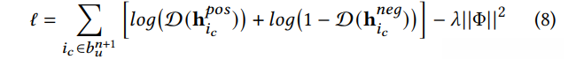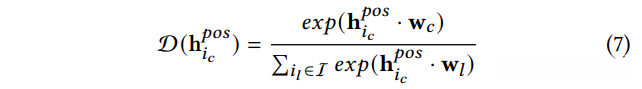 where w𝑐 and w𝑙 are the learnable preference embeddings for item 𝑖𝑐 and 𝑖 𝑙 respectively, D (h 𝑝𝑜𝑠 𝑖𝑐 ) ∈ (0, 1) is the likelihood where a larger value indicates the higher preference. Then the objective function is formulated as follows: