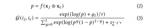 where 𝑔𝑦 is i.i.d sampled from a Gumbel distribution as a noisy disturber: 𝑔 = − log(− log(𝑥)) and 𝑥 ∼ Uniform(0, 1). 𝜏 > 0 is the temperature parameter to smooth the discrete distribution of G. That is, 𝜏 adjusts the sharpness of the relevance estimation generated by G.