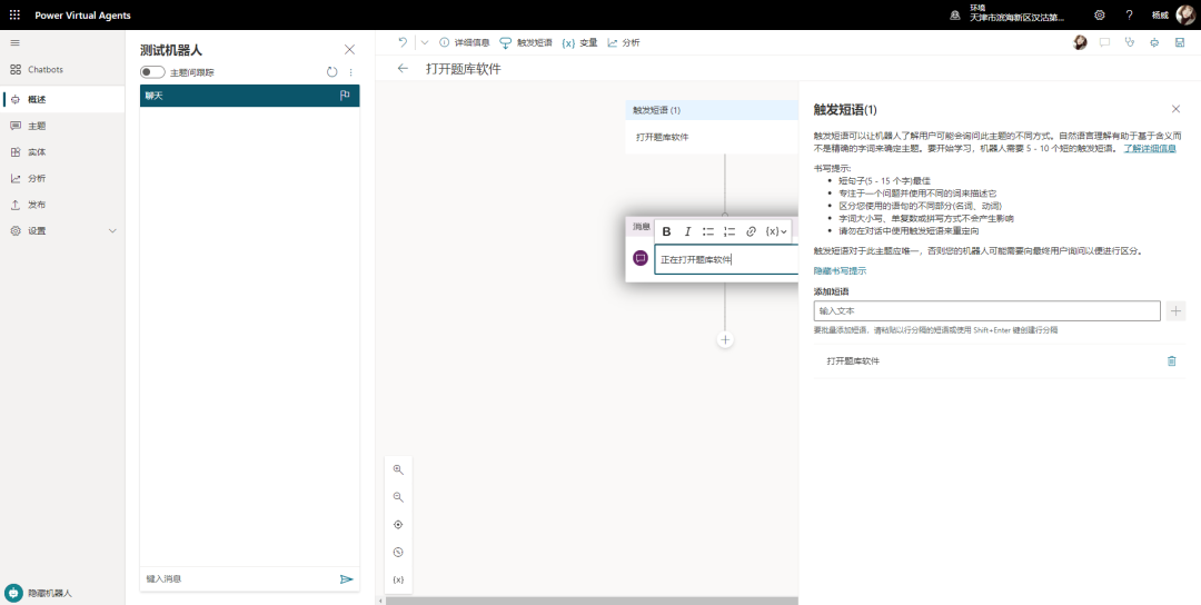 今天我们来介绍如何利用Power Virtual Agents来远程控制电脑。我们的设计思路是在聊天机器人里输入触发短语后打开自己电脑中的题库软件。