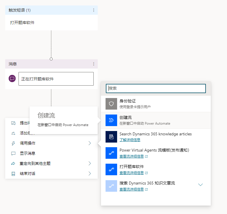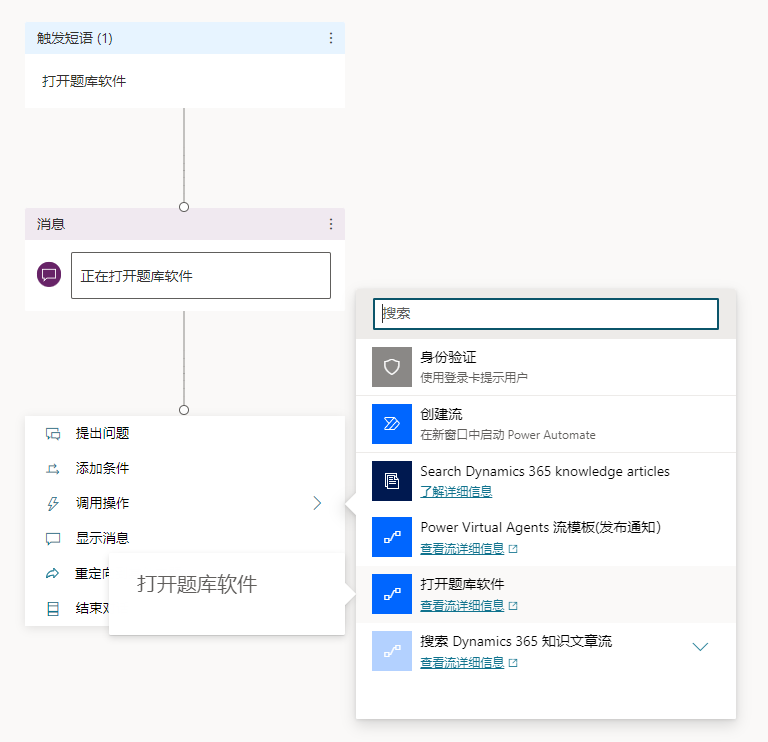 回到Power Virtual Agents编辑菜单选择“调用操作”然后就会出现刚才创建的工作流。