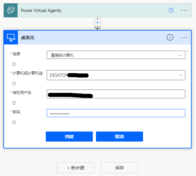 在“计算机或计算机组”中选择要远程操控的计算机的设备名称,输入“域和用户名”和“密码”后点击“创建”。