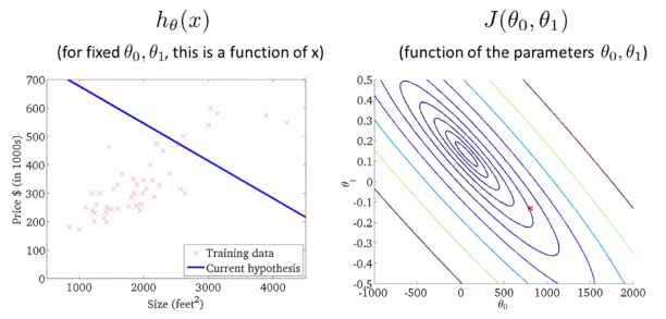 左图展示了当θ₀取a、θ₁取b时的假设函数图形;右图中的红色标记点代表了当θ₀=a和θ₁=b时对应的J值;显然,在这种情况下拟合效果不佳,并且计算出的J值相对较大;显然,在这种情况下最佳拟合点位于椭圆环中心位置;我们的核心目标就是如何找到这些参数使得代价函数达到最小值;因此我们需要开发一个算法来自动计算这些使代价函数最小化的参数θ₀和θ₁
