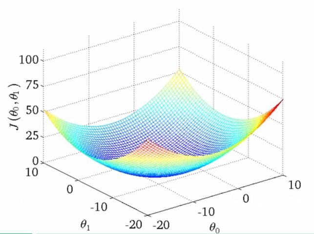 在进行线性回归任务时所使用的 代价函数 呈现这样的U型形状,并被专业术语称为该凸目标函数。由于其性质特征,在优化过程中该凸函数仅具备单一全局最小值点而无局部极小值。因此该凸函数仅具备单一全局最小值点而无局部极小值,并且无论何时,在应用线性回归模型配合梯度下降算法处理该代价函数时,最终所得的结果必然是这个全局最小值点。