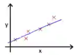 在进行线性回归时, 我们有一个训练数据集, 可能像我在图上所画出的一样。我们的目标是 得出θ₀、θ₁这两个参数的值 来使假设函数表示的一条直线 尽可能地贴近这些数据点。也许就像这里的这条线一样