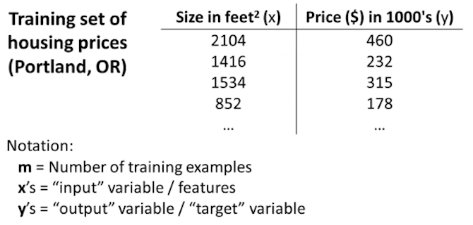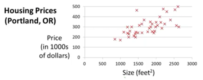 那么这就是监督学习算法的一个具体体现。它之所以被称为监督学习,是因为对于每一个数据点来说,我们提供了正确的标签或值——即告诉我们根据这些数据点的信息,房子的实际价格是多少。