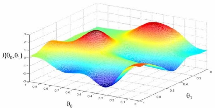 通过简单的计算即可获得自变量θ₀和θ₁变化时的成本函数三维分布图。如图所示,该成本曲面呈现出类似抛物线型的空间曲线,需要注意的是,线性回归的成本函数是一个凸函数,在整个定义域内只有一个全局最小值点。后续将简要介绍几种非凸形式的成本函数及其特性