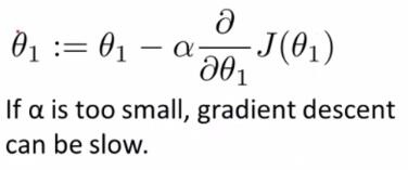 从这个迭代公式可以看出学习速率α是一个正数。通过绘制图形我们可以直观地观察到无论学习速率α取何正值时新参数θ₁都会朝着使目标函数J减小的方向变化。这体现了该公式的本质。