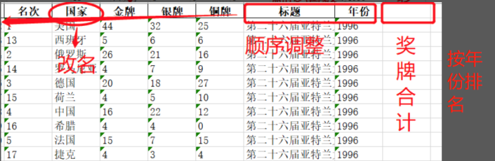 columns = ['标题','年份','国家','金牌','银牌','铜牌']