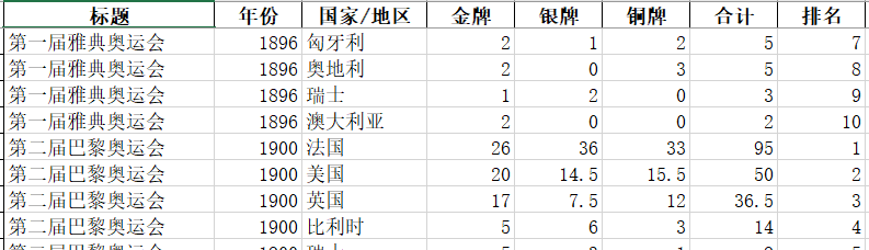columns = ['标题','年份','国家','金牌','银牌','铜牌'] df = pd.DataFrame(df, columns=columns)