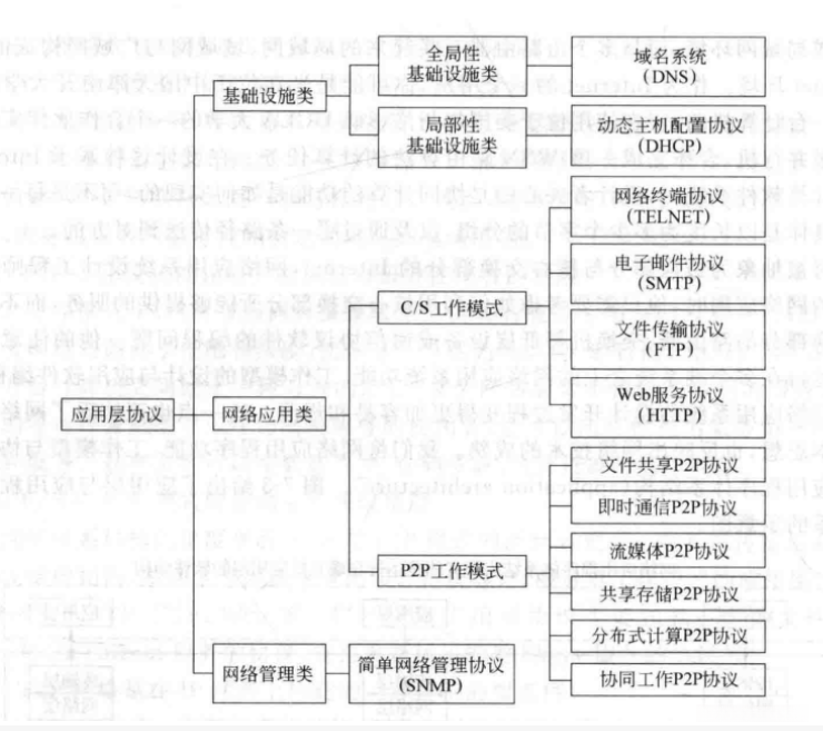 根据应用层协议在Internet中的作用和提供的服务功能,应用层协议可以分为三种基本 类型:基础设施类、网络应用类与网络管理类。图中给出了主要应用层协议分类的示意图。
