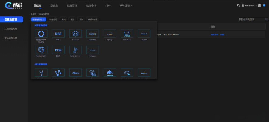 平台支持多样化的 databases 接入服务(包括但不限于关系型 database 和分布式 database)。该平台可使业务系统的数据在该平台上实现对接与建模分析的需求。具体的数据库类型包括:Mysql、Oracle、SQL Server、DB2、GBase、PetaBase 和 Essbase 等等,并且允许用户根据需要选择并配置不同的 database 驱动程序来建立连接。