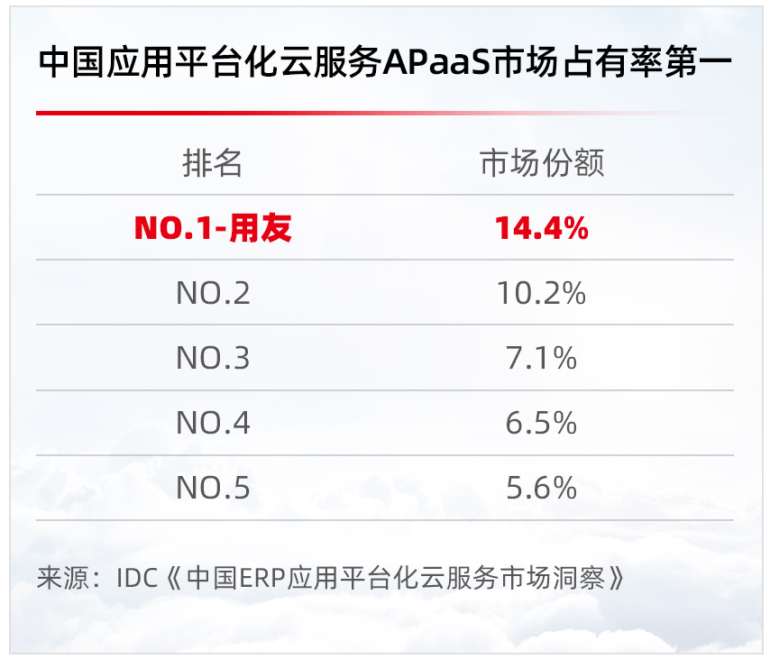 IDC发布了《中国ERP应用平台化云服务市场洞察》报告,并长期占据中国APaaS(应用平台化云服务)行业的领先地位。报告数据显示该公司的市场份额达到14.4%,这一成绩充分凸显了用友在该领域的领先地位。