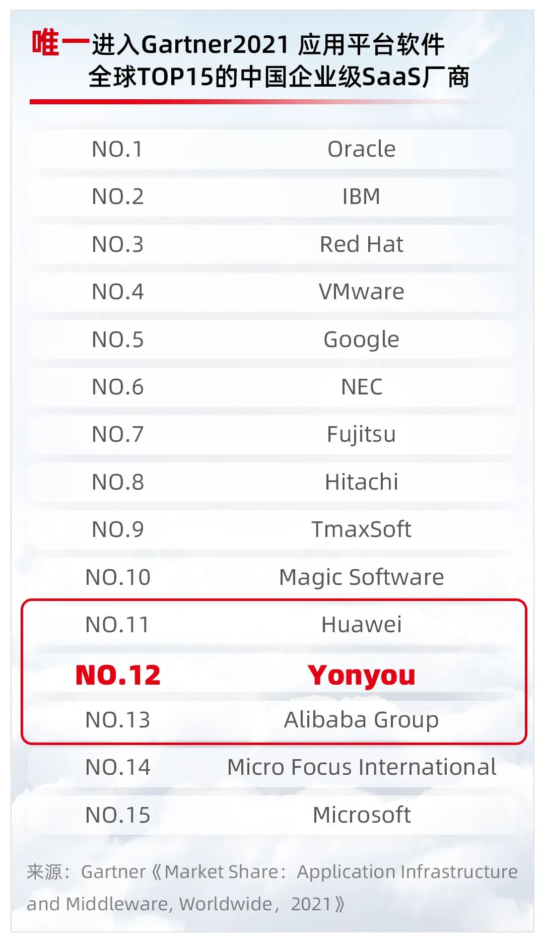 经全球领先的信息技术研究及咨询机构Gartner发布于《Market Share: Application Infrastructure and Middleware, Worldwide, 2021》的报告指出:用友在Application Platform Software领域的市场占有率位列全球第十二位,并与华为、阿里巴巴等企业共同跻身全球前十五名。值得注意的是,在中国科技企业中,仅用友一家即可代表中国企业级软件服务领域的领先地位。同时该报告指出:以用友为代表的中国科技企业的平均发展速度位列行业第一