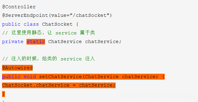 spring 或 springboot 的 websocket 里面使用 @Autowired 注入 service 或 bean 时,报空指针异常,service 为 null(并不是不能被注入)。 解决方法:将要注入的 service 改成 static,就不会为null了。