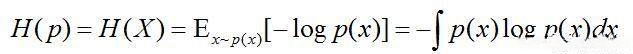 在刚刚的步骤中已经定义了单个点处的香农信息量,在接下来的部分中我们需要探讨如何评估随机变量X(或其整个样本空间)的整体香农信息量呢?下面将介绍随机变量X的信息熵这一重要概念,并将其与概率分布p相结合进行分析。这里所说的H(p),即为被定义为香农信息量-logp(x)的数学期望值的一种指标;它具体表现为所有可能取值x对应的香农信息量之和,并且考虑到每个x出现的概率不同(由概率密度函数值p(x)来度量),因此在计算过程中需要用每个p(x)进行加权求和的操作才能得到准确的结果;其数学表达式如下所示: