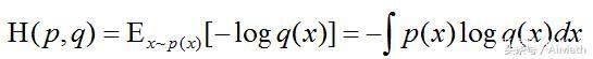 在每个样本点X=x处,我们定义了q所对应的香农信息量为-log q(x)。即为,在该点使用的分布q所能消除与目标分布p相关的不确定性程度定义为-log q(x)(此处理解为衡量q在X=x处为了拟合p所作的努力)。进而可计算出整个样本空间内基于分布q消除与p相关的不确定性总量。其中每个样本点x的概率权重由p(x)决定,则交叉熵H(p,q)即为此处的度量。