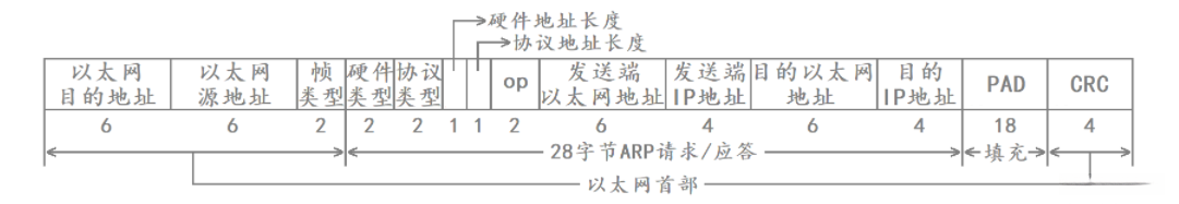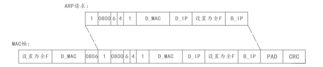 ARP属于MAC帧协议的上层协议,在其数据格式中包含前三个字段以及最后一个字段来构成以太网头部。然而,在将这些数据包封装为MAC帧时需要补充18字节填充字段以满足要求。