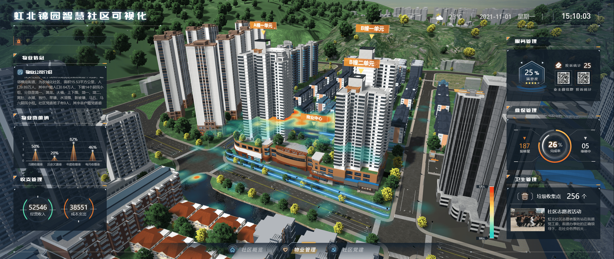 物业数据管理主要在社区执行,涵盖缴费与收据相关的处理流程等,同时在热力图上直观地呈现了居民活动区域