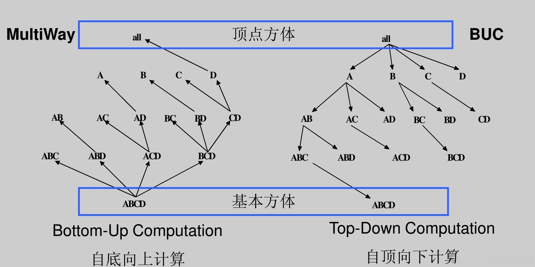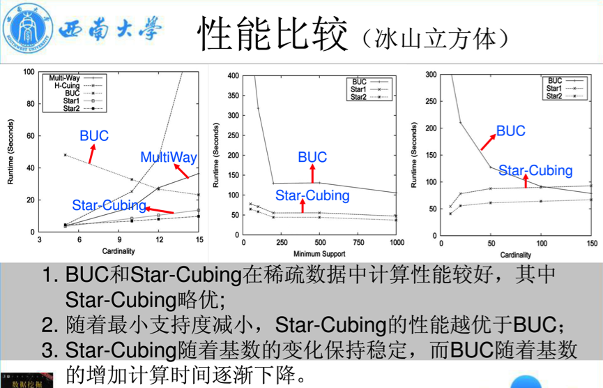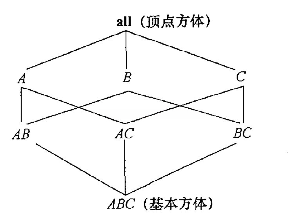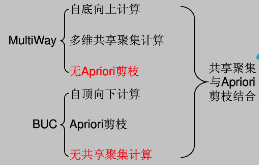 - BUC(Bottom-Up Construction):从顶点方体向下计算稀疏冰山立方体