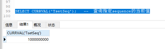 SELECT CURRVAL('TestSeq'); -- 查询指定TestSeq 的sequence的当前值