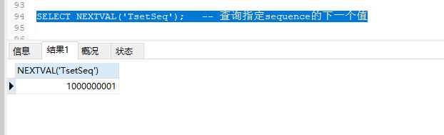 SELECT NEXTVAL('TestSeq'); -- 查询指定TestSeq 的sequence的下一个值