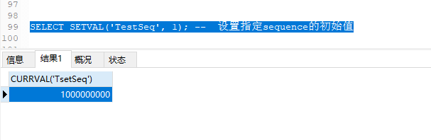 SELECT SETVAL('TestSeq', 1000000000); -- 设置指定TestSeq 的sequence的初始值